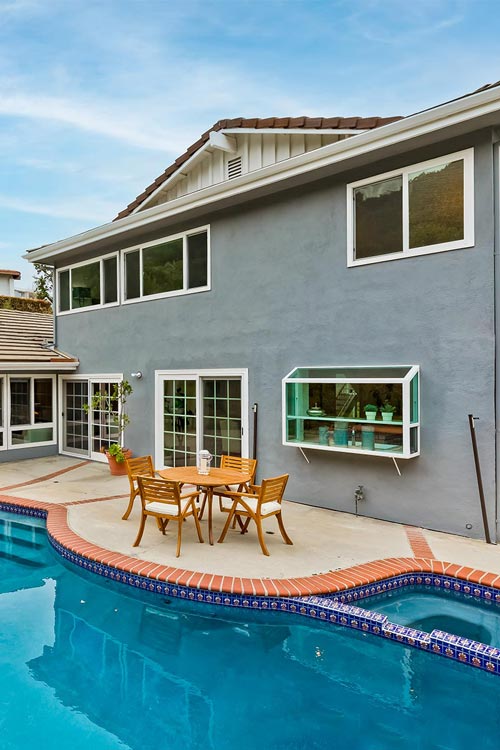 Impeccable, move-in ready 2-story, 5 bedroom + 3.5 bath plus den/office Traditional with sparkling grey bottom pool w/city & ocean views in the Hills of Mandeville Canyon. Freshly painted inside and out w/inviting 2 story entrance w/new chandelier + lots of natural light throughout. Open floor plan, large scale rooms, new wide plank Coconut Oak laminate flooring throughout, dual pane windows + sliders and recessed lighting. Main bedroom suite upstairs with new mirrored closet doors, tiled bathroom with dual sinks, large soaking tub and separate shower. 3 additional bedrooms upstairs share lg. bathroom with guest suite downstairs. Open cooks kitchen w/large island and prep sink, Subzero, double ovens and gas cooktop, breakfast and family room combination, built-in desk area perfect for studying, formal dining room with new chandelier, beautiful living room with wood beamed ceiling and white brick fireplace. Separate den/office or media room. Beautiful yard featuring lush landscaping, grass area and multiple seating areas including a covered patio for comfortable outdoor dining. Whole home fan system. Direct access from the 3 car side-by-side garage with very fine front loading washer/dryer in the laundry area of the garage. This is the home you have been waiting for!